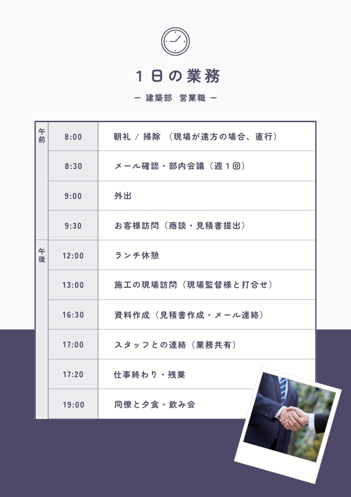 ・建築部 営業職は、お客様との信頼関係を築き、案件獲得を担います。現場が遠方の場合は直行もありますが、基本的には朝礼・掃除で業務開始です。