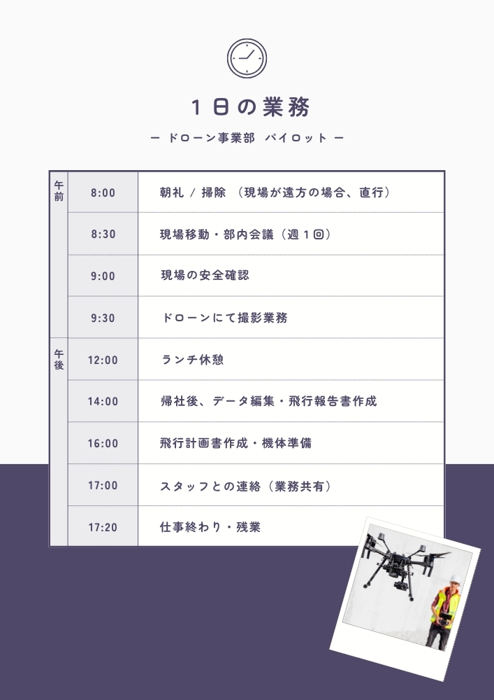 ・朝礼・掃除を終えたら(現場が遠方の場合は直行)現場へ移動し、現場の安全確認を行った後、ドローンでの撮影業務を行います。