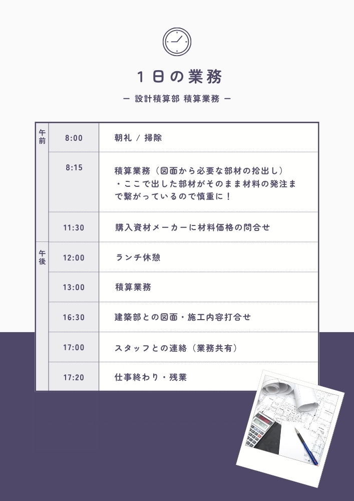 ・お昼前には購入資材メーカーへ材料価格の問合せを行い、午後は再び積算業務に集中します。