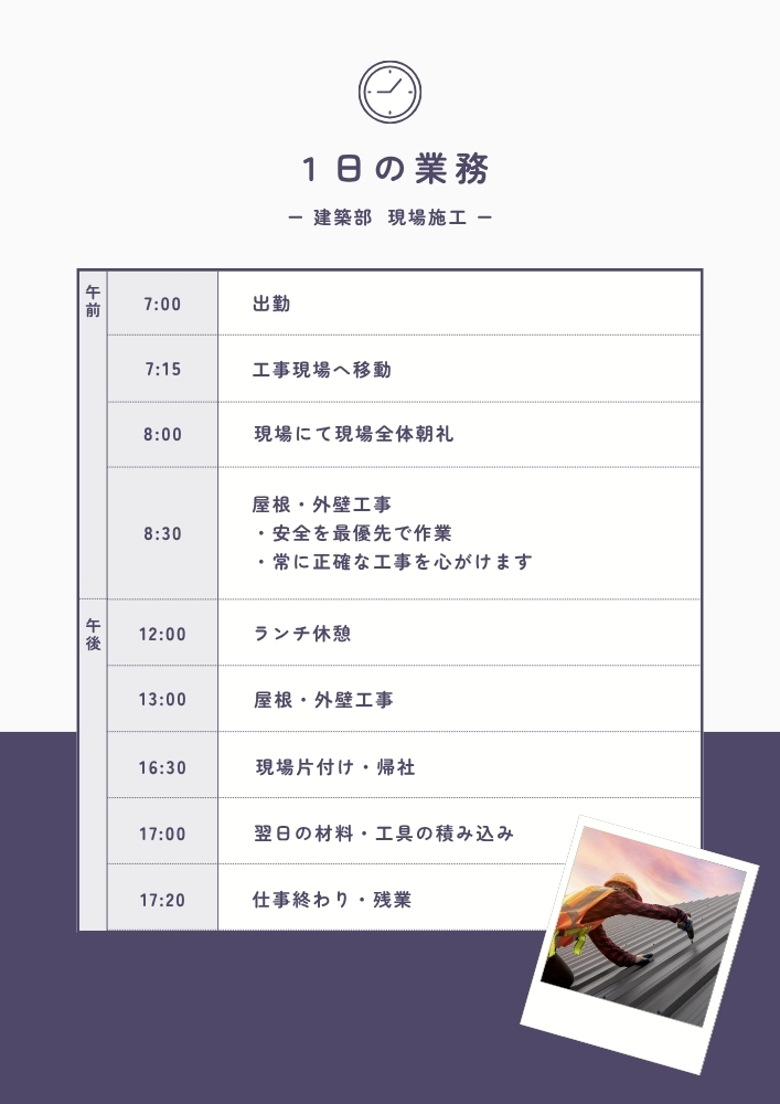 ・帰社後は、翌日の材料や工具の積み込みを行い、17:20に一日の業務を終える予定。