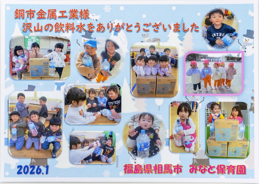 このたび、東日本大震災の被災地である福島県内の「みなと保育園」様および「原町聖愛こども園」様へ、支援物資として飲料水を寄贈いたしました。