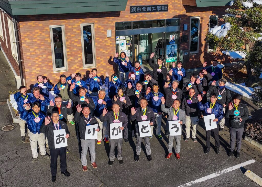 いただいたメダルは社員一人ひとりが大切に首にかけ、感謝を込めて記念撮影を行いました。上空からは、社員全員の笑顔とともに、園児たちへの「ありがとう」のメッセージを写真に収めています。