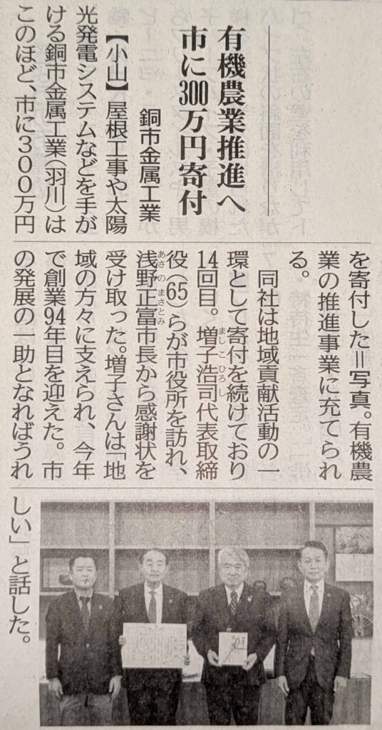 紙面では、弊社の小山市における有機農業の普及と発展を支援するための寄付活動について