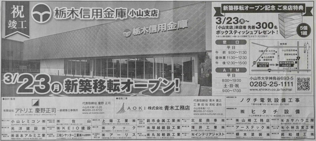 2026年3月23日(月)に新築移転オープンされる、栃木信用金庫 小山支店様の新築工事において、