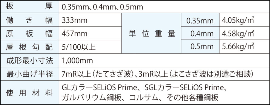 - 広幅な葺き板:大きな山高と333mmの広い葺き板で、ダイナミックで個性的な屋根を表現します。