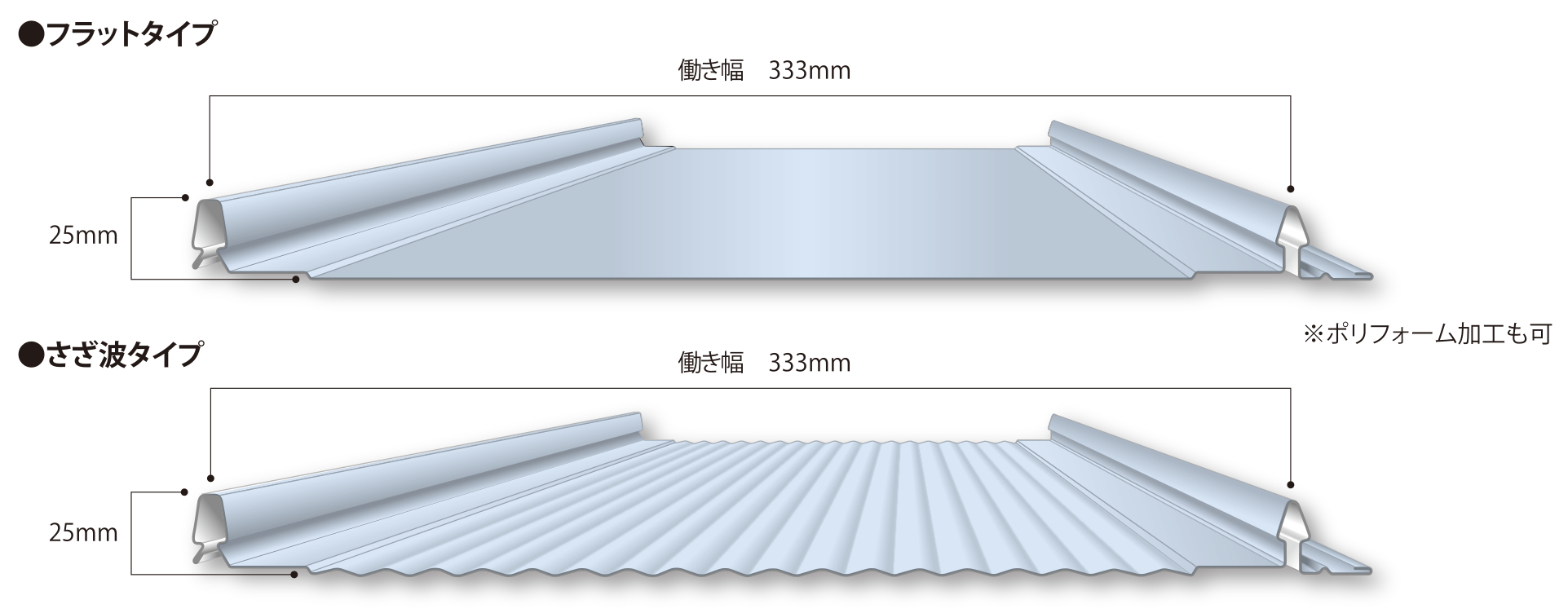 - シャープな外観:すっきりした縦のラインが美しい屋根を表現します。葺き板の表面は、フラットタイプとさざ波タイプの2種類があります。