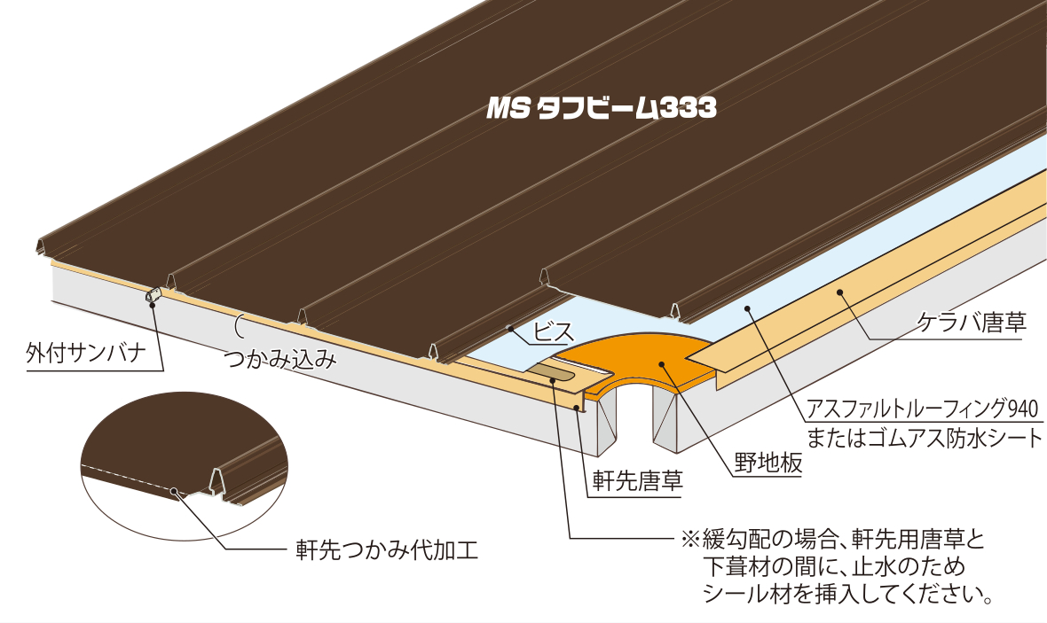 - 吊子不要の一体型:吊子部分が一体成型されたシンプルな葺き板で、直接下地に取り付けられ、上から踏み込むだけのかん合構造で